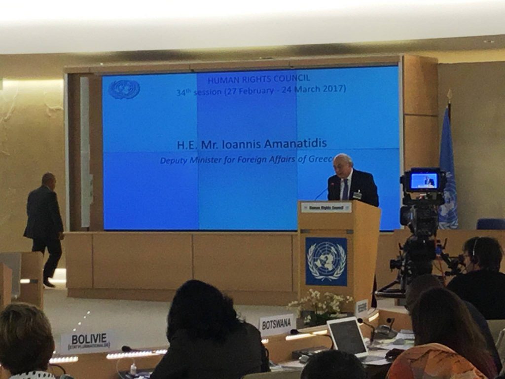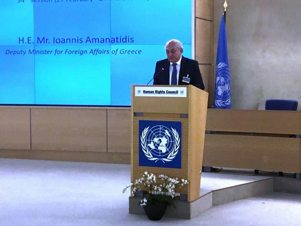 «Η Ελλάδα παραμένει πλήρως προσηλωμένη στον διαρκή στόχο της υπεράσπισης, προστασίας και προώθησης των Ανθρώπινων Δικαιωμάτων όλων των προσώπων που διαμένουν στην χώρα ή διέρχονται μέσω αυτής, αποκλείοντας κάθε μορφή ρατσισμού ή διάκρισης για εθνοτικούς, θρησκευτικούς, έμφυλους ή άλλους λόγους» τόνισε ο Υφυπουργός Εξωτερικών, κ. Γιάννης Αμανατίδης, από το βήμα του Τμήματος του Yψηλού Επιπέδου 34ης Συνόδου του Συμβουλίου Ανθρωπίνων Δικαιωμάτων, των Ηνωμένων Εθνών, στη Γενεύη.