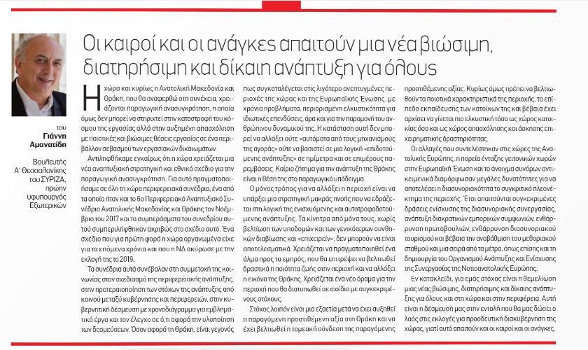Αντιληφθήκαμε, εγκαίρως, ότι η χώρα χρειάζεται μια νέα αναπτυξιακή στρατηγική και εθνικό σχέδιο για την παραγωγική ανασυγκρότηση. Γι’ αυτό πραγματοποιήσαμε σε όλη τη χώρα περιφερειακά συνέδρια, ένα από τα οποία ήταν και το 6ο Περιφερειακό Αναπτυξιακό Συνέδριο Ανατολικής Μακεδονίας και Θράκης τον Νοέμβριο του 2017 και τα συμπεράσματα του συνεδρίου αυτού συμπεριλήφθηκαν ακριβώς στο σχέδιο αυτό.
